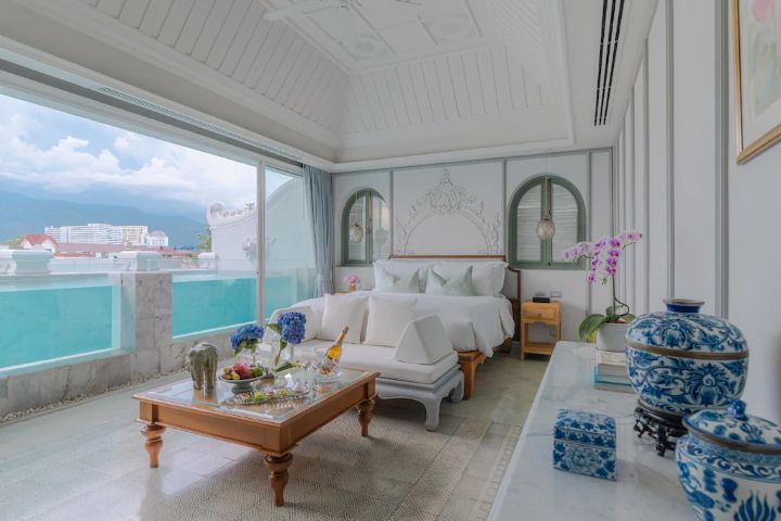 チェンマイのプール付き高級ホテルの中でも、川沿いの落ち着いた雰囲気とロマンチックな空間が特徴です。派手なリゾートではなく、静かで心地よい時間を過ごせる環境が整っており、カップルや特別な滞在に向いています。