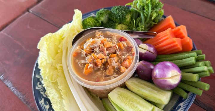 ナムプリックは単体で食べるものではなく、ゆで野菜や生野菜、肉や魚と一緒に食べるのが基本です。
