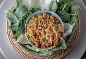 ソムタムラオのベースとなる青パパイヤは、シャキシャキとした食感が特徴です。すり鉢で軽く叩いて作ることで味がよくなじみ、食感と味の両方を楽しむことができます。