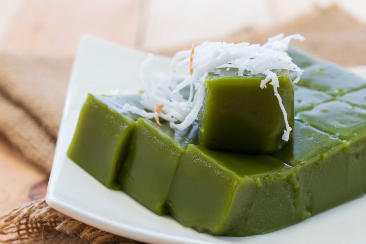 このスイーツの印象的な緑色は、人工着色ではなく「パンダンリーフ」という植物から付けられています。パンダンは東南アジアでよく使われる香りづけの素材で、ほんのり甘く香ばしい独特の香りが特徴です。