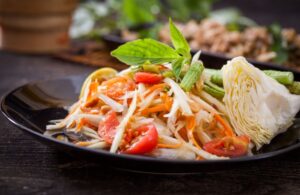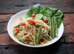 「ソム」は“酸っぱい”、「タム」は“叩く”という意味を持ち、青パパイヤを千切りにして、ナンプラー、にんにく、ライム、ココナッツシュガー、干しエビなどと一緒に臼と杵で叩きながら和えるのが基本のスタイル。